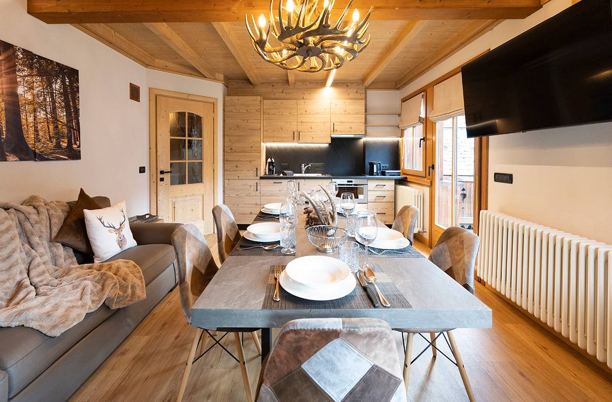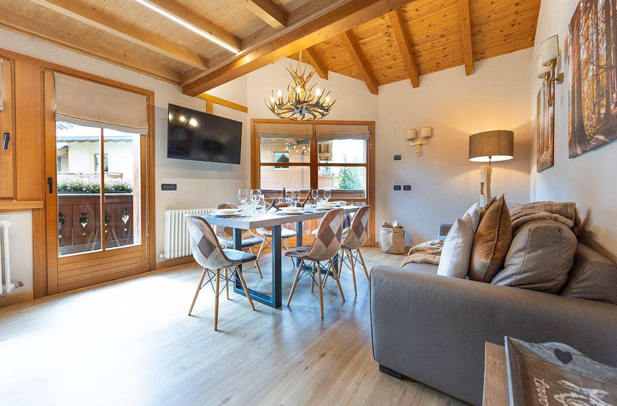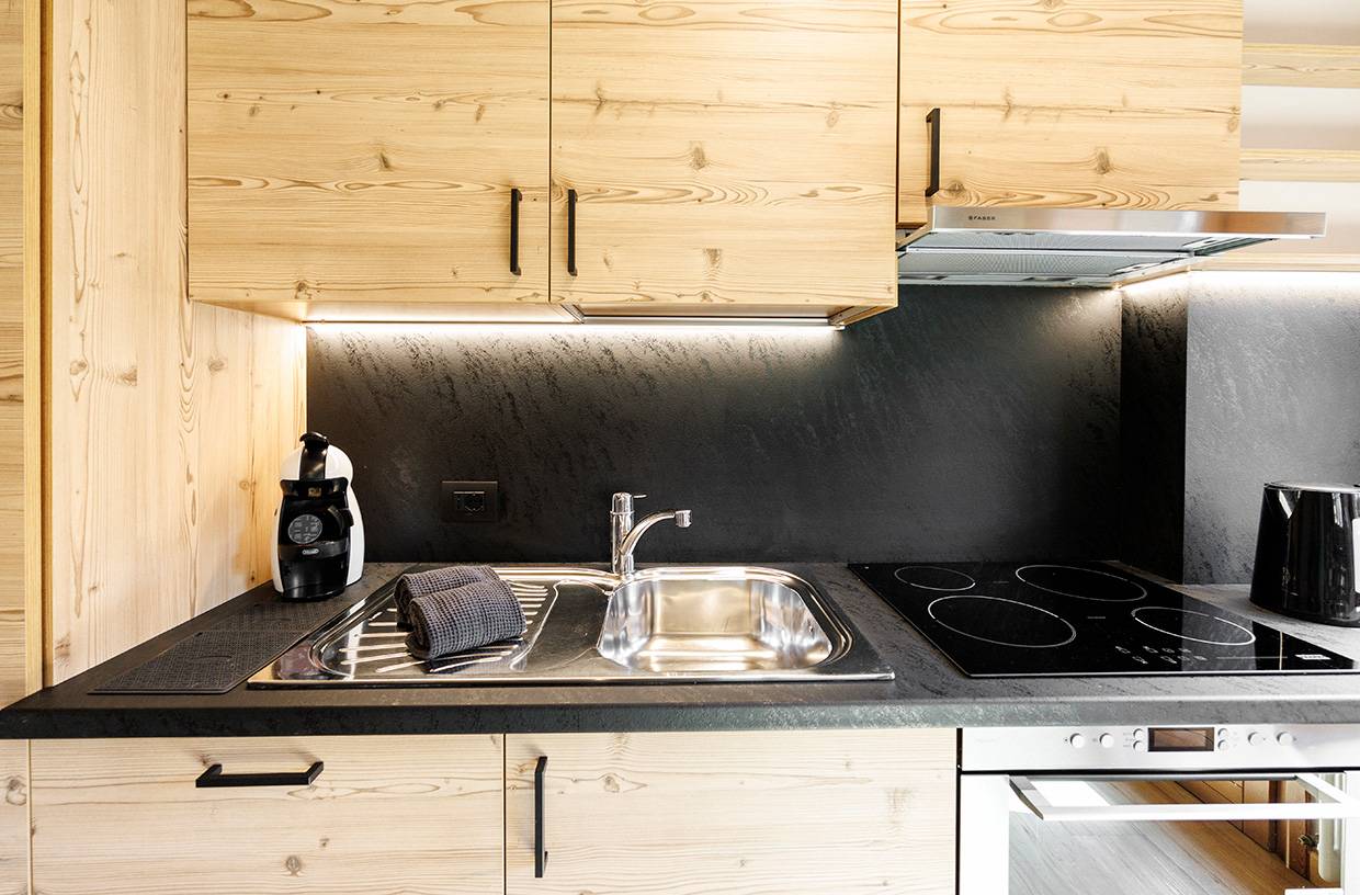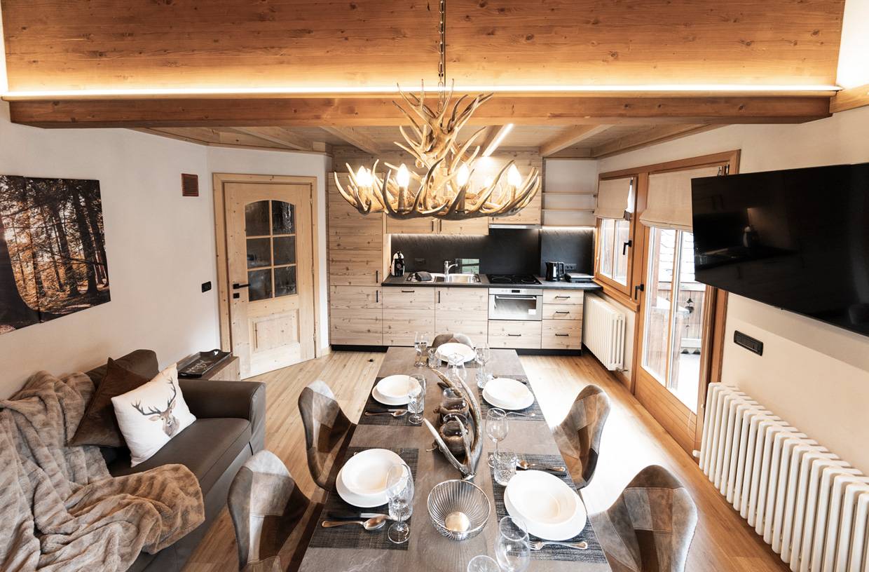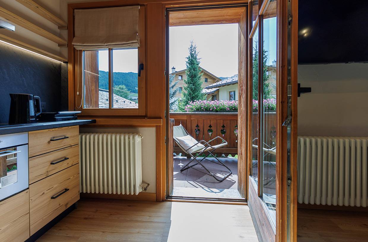 Ampio soggiorno con divano e angolo cottura con frigorifero con ampio congelatore, lavastoviglie, piano cottura in vetroceramica, forno combinato, tostapane, bollitore, macchina da caffè a cialde "Dolce Gusto", Smart TV Samsung e balcone con sdraio